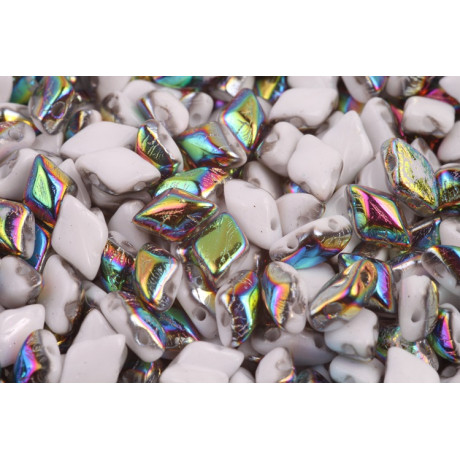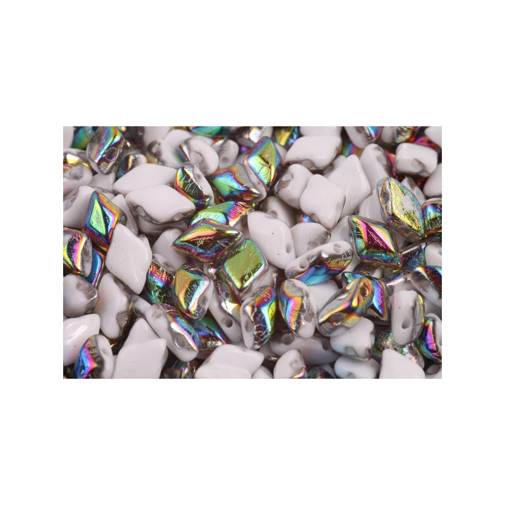 Rozměry 8x5 mm a precizně kalibrované dva otvory o průměru 1 mm dělají z těchto korálků Matubo GemDuo nezbytný prvek pro každou pokročilou autorku šitých šperků. Barevná úprava Chalk Vitrail (kód 03000/28101) představuje unikátní pokov na neprůhledném bílém základu, který vytváří fascinující duhové odlesky měnící se podle úhlu dopadu světla.