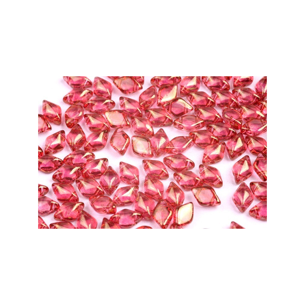 Povrchová úprava Crystal Red Luster dodává čirému skleněnému základu sytý, až vínově růžový nádech s jemným metalickým odleskem. Tato vizuální kombinace vytváří hloubku a dynamiku, kterou nejlépe využijete v plochých i prostorových vzorech, kde se světlo přirozeně odráží od hran kosočtverce. Krásně ladí s neutrálními zlatými akcenty nebo černým jetem pro vytvoření dramatického kontrastu.