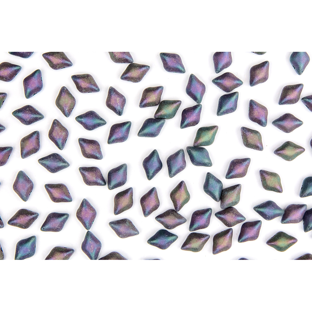 Hluboké tóny temného skla s matným měňavým povrchem evokují křídla exotických brouků nebo tajemnou hlubinu vesmíru. Tyto české skleněné korálky typu Matubo GemDuo v barvě Jet Red Iris Mat přinášejí do světa bižuterie jedinečný tvar kosočtverce se dvěma otvory.