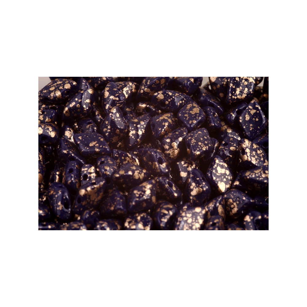 Navy modrý základ s efektním zlatým postřikem definuje tyto dvoujamkové korálky MATUBO GEMDUO č.464 o rozměru 8x5 mm. Precizní výlisky z kvalitní české skloviny vynikají naprostou tvarovou konzistencí a hladkými okraji otvorů o průměru 1 mm, což minimalizuje riziko proříznutí návlekového materiálu. Při práci s tímto materiálem oceníte zejména plochou spodní stranu a přesně umístěné otvory, které umožňují dokonalé lícování v náročných geometrických vzorech a prostorových kompozicích.