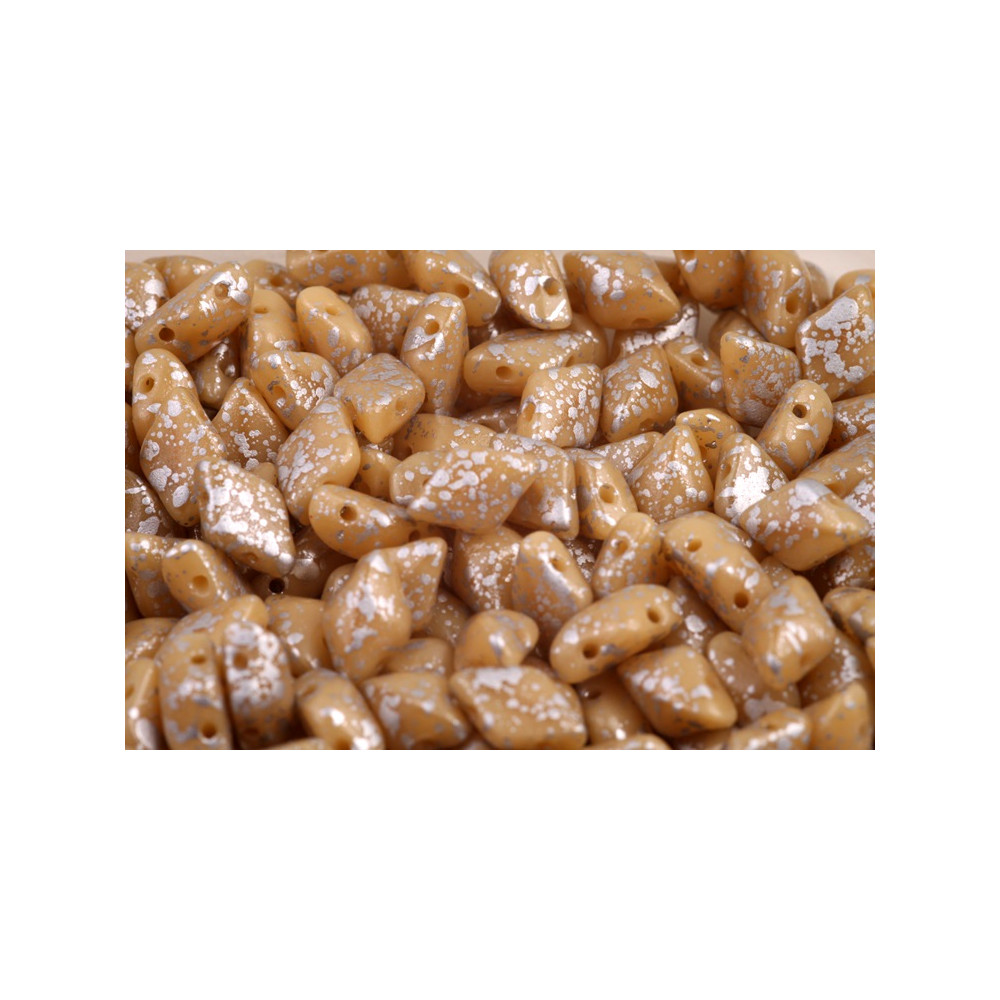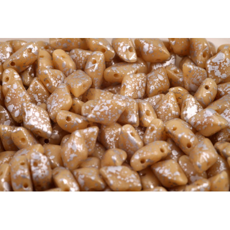 Základem je neprůhledná krémová sklovina s efektním stříbrným nástřikem, který vytváří unikátní metalické odlesky na každém kusu. Tyto české skleněné korálky jsou vyrobeny technologií lisování, která zaručuje tvarovou stálost a přesné rozmístění otvorů. Pro jemné detaily a vyplnění menších mezer v designu se skvěle hodí menší varianta Matubo MiniGemDuo, se kterou tvoří harmonický celek.