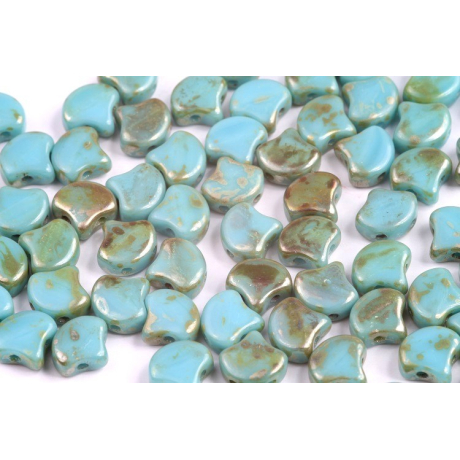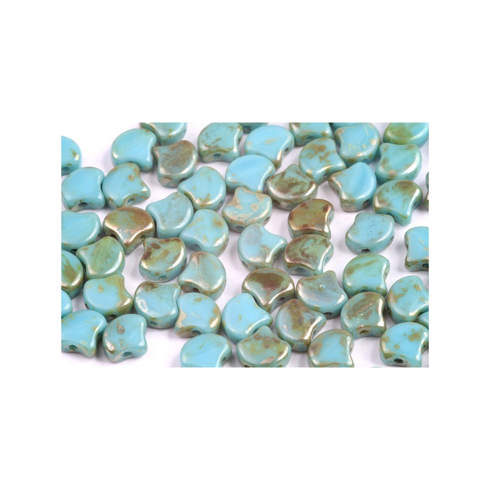 Objevte jedinečné dvoudírkové korálky Matubo Ginko, které vynikají svým elegantním tvarem inspirovaným listem jinanu. Tyto české skleněné korálky o velikosti 7,5 x 7,5 mm jsou vyrobeny z prvotřídní skloviny Preciosa Ornela v dílně renomovaného výrobce Matubo. Specifický odstín Turquoise Blue Rembrandt kombinuje hloubku tyrkysové barvy s efektní patinou, která dodává každému kusu originální a lehce rustikální vzhled.