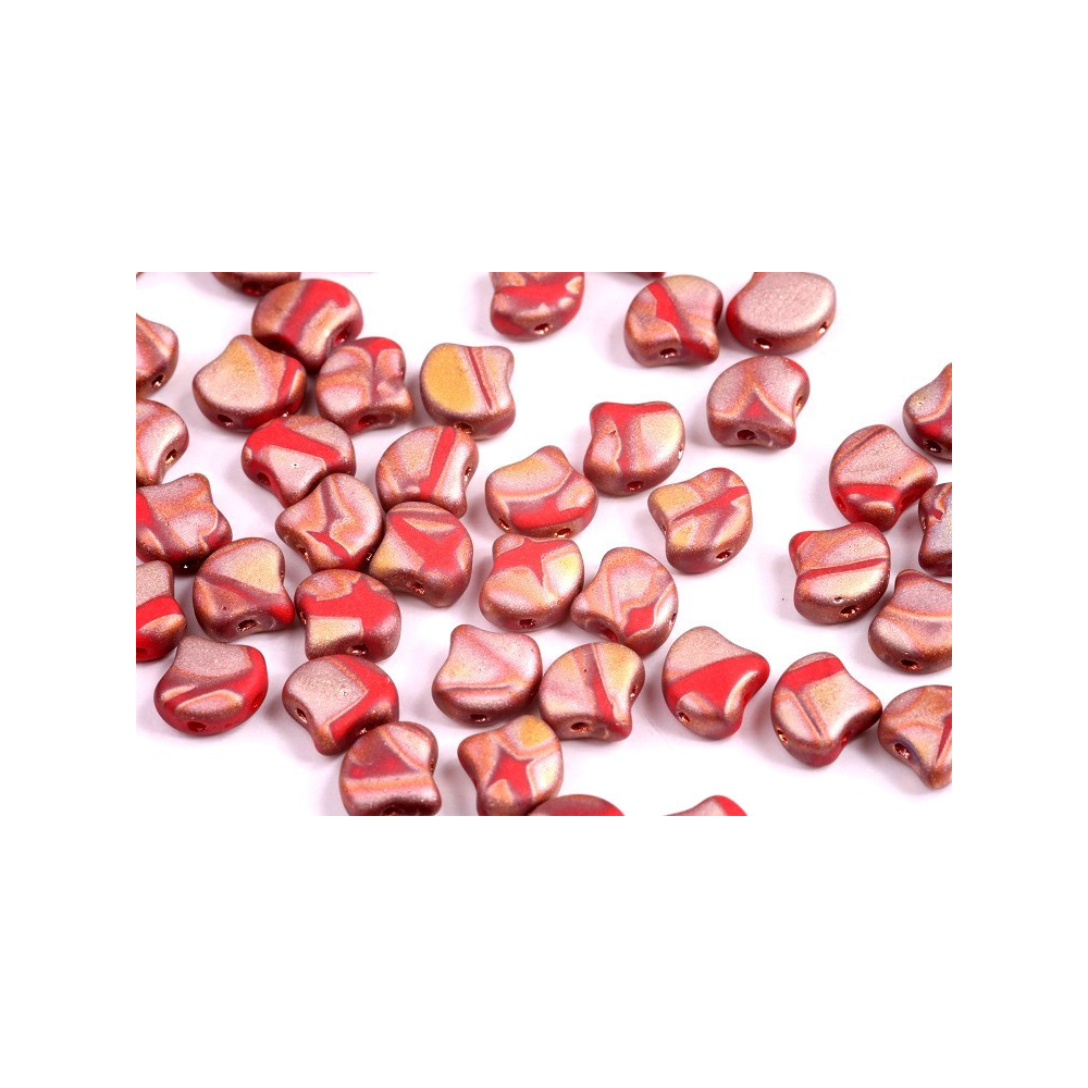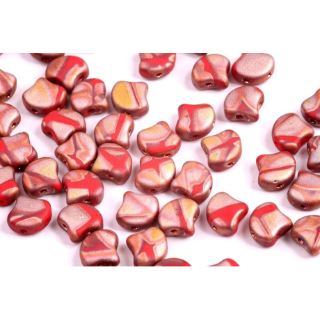 Skleněné mačkané korálky Ginko 7,5 x 7,5 mm OPAQUE CORAL RED FULL CAPRI GOLD MAT BATIK 93200/27173BA
