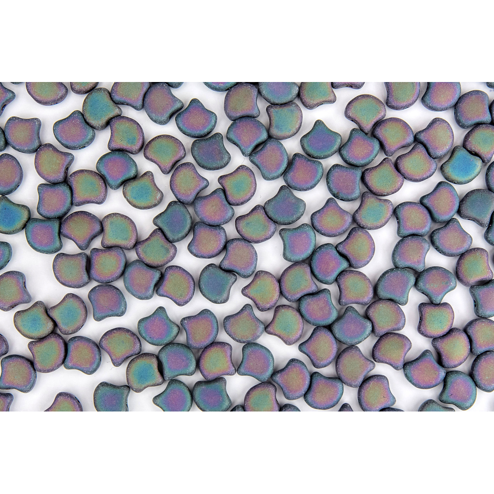 Díky své specifické velikosti 7,5 x 7,5 mm jsou tyto dvoudírkové korálky ideální pro techniku beadweaving (šitý šperk). Povrchová úprava iris mat vytváří na tmavém podkladu jemné metalické odlesky v tónech fialové, zelené a bronzové, které dodají vašim projektům luxusní a dramatický vzhled. Matný povrch je velmi příjemný na dotek a v kombinaci s iris efektem působí moderním, sofistikovaným dojmem.