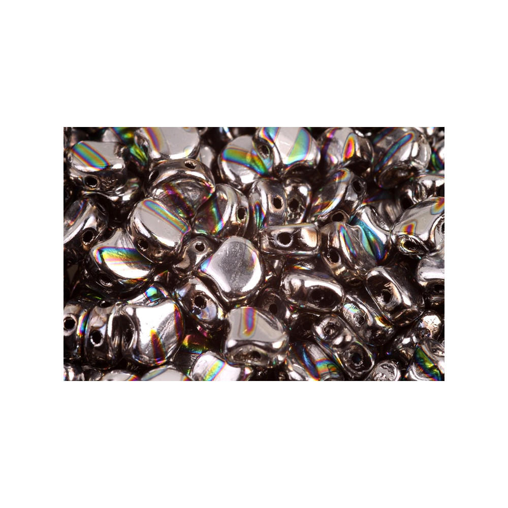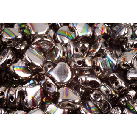 Duhový efekt na metalickém podkladu Jet Silver Rainbow Line dodává každému kousku hloubku a luxusní vzhled, který vynikne zejména při použití techniky beadweaving. Pro dosažení maximálního detailu a vyplnění drobných prostor mezi lístky skvěle poslouží drobný rokajl Preciosa, který celou kompozici zpevní a barevně sjednotí. Balení obsahuje přibližně 20 kusů korálků, přičemž tento počet je orientační a závisí na konkrétní hmotnosti dané šarže. Krásně ladí se šedými odstíny pro jemný přechod, ale pro výrazný kontrast je zkombinujte s tmavým bronzem. Díky hladkému povrchu a přesně vrtaným otvorům je práce s tímto materiálem radostí pro začátečníky i pokročilé mistry, kteří hledají neotřelé tvary pro své autorské designy.