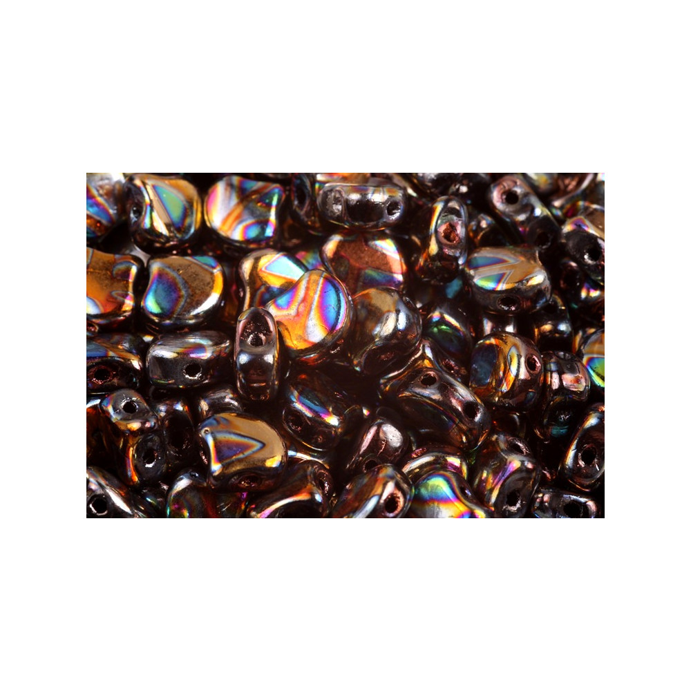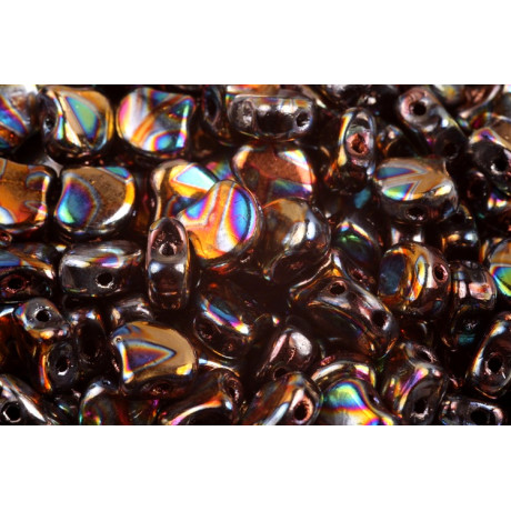 Oranžové a duhové odlesky na temném podkladu dělají z těchto skleněných korálků Matubo™ Ginko ideální volbu pro nápadité a strukturální šperky. Díky unikátnímu tvaru připomínajícímu list jinanu a preciznímu zpracování z českého skla jsou tyto dvoudírkové korálky o velikosti 7,5 x 7,5 mm nepostradatelné pro pokročilé techniky šité bižuterie. Při tvorbě složitých květinových vzorů se skvěle doplňují s menšími prvky, kdy se jako výplň mezi Ginko korálky výborně hodí drobný rokajl Preciosa v odpovídajících metalických odstínech.
