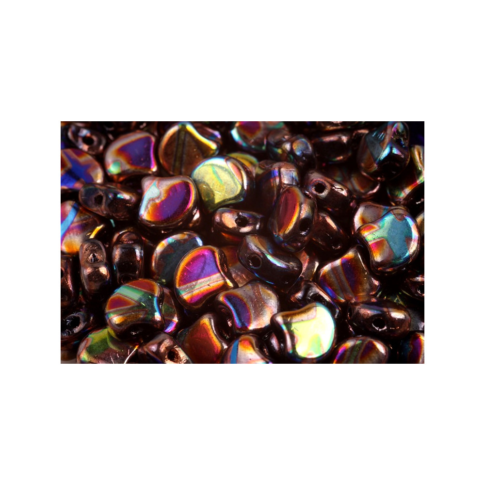 Rozměr 7,5 x 7,5 mm je ideální pro tvorbu efektních obšívaných kuliček nebo elegantních náramků, kde do sebe jednotlivé ginkgo lístky díky svému tvaru přesně zapadají. Díky dvěma dírkám se korálky při práci nepřetáčejí a drží pevně v požadované pozici, což je klíčové pro korálkování náročnějších prostorových objektů a 3D designů. Tmavý základ korálku s duhovým pokovením dodává hotovým projektům hloubku a luxusní nádech.