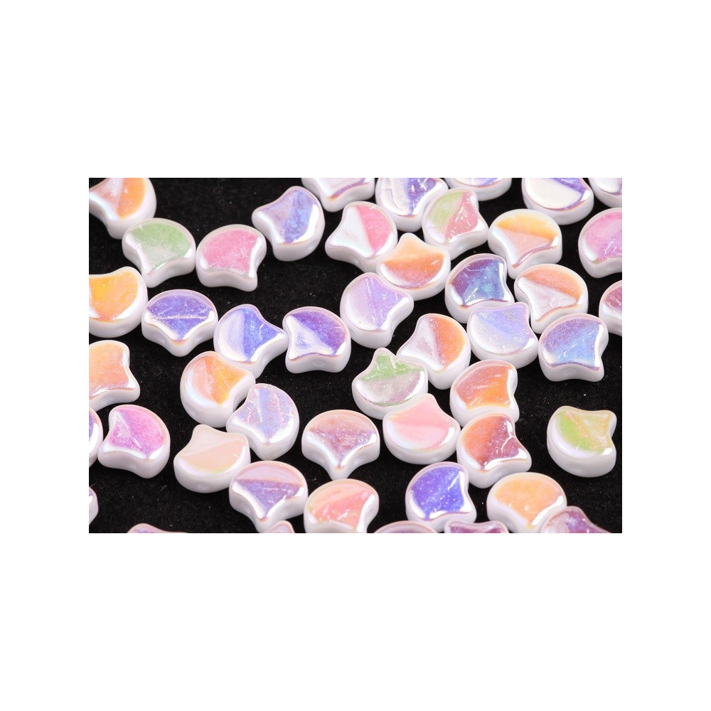 Objevte jedinečné korálky Matubo Ginko v podmanivé barvě Chalk Full AB. Tyto české skleněné korálky svým tvarem připomínají listy jinanu dvoulaločného a do vašich projektů vnesou organický prvek a moderní eleganci. Jsou vyrobeny z vysoce kvalitní skloviny Preciosa Ornela, která zaručuje přesný tvar a stálost barev. Povrchová úprava Full AB vytváří na bílém podkladu intenzivní duhové odlesky, které se mění při každém dopadu světla.