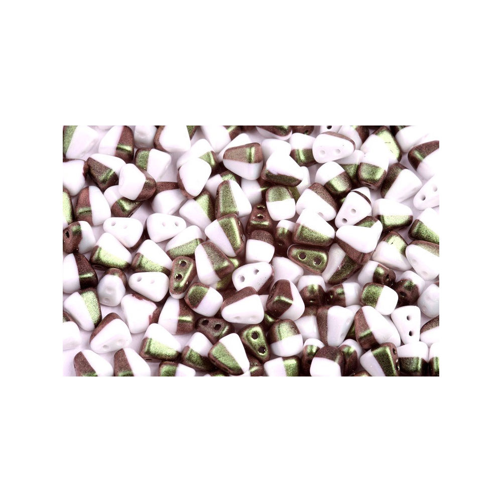 Rozměry 6x5 mm a precizně vylisovaný klínovitý tvar dělají z těchto korálků Matubo™ Nib-Bit nepostradatelný prvek pro geometricky přesné šité šperky. Dva paralelní otvory o průměru 0,8 mm jsou dokonale hladké, což zajišťuje snadný vícenásobný průchod nití korálkem bez rizika poškození materiálu. Tato varianta Duets vyniká dvoubarevným efektem, kdy je jedna strana korálku ponechána v krémovém tónu a druhá nese metalický nános v odstínech šalvěje a citrusu.