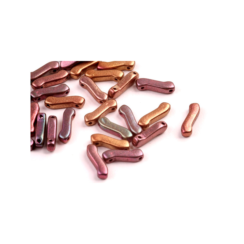 Rose gold metalický povrch s iridescentními odlesky definuje tyto precizní dvoudírkové korálky Matubo Z Bead o velikosti 10 mm. Jsou vyrobeny z prvotřídního českého skla a vyznačují se naprostou tvarovou konzistencí, která je klíčová pro náročné projekty geometrického bead weavingu. Každý korálek disponuje dvěma paralelními otvory o průměru 0,8 mm, které jsou dokonale hladké a šetrné k návlekovému materiálu, jako je univerzální nit S-lon nebo extrémně pevná nit S-lon FIRE. Díky svému unikátnímu esovitému tvaru do sebe korálky při šití přesně zapadají a skvěle se doplňují s menšími prvky, jako jsou Matubo SuperDuo nebo drobný rokajl Preciosa velikosti 10/0.