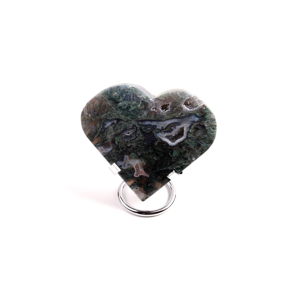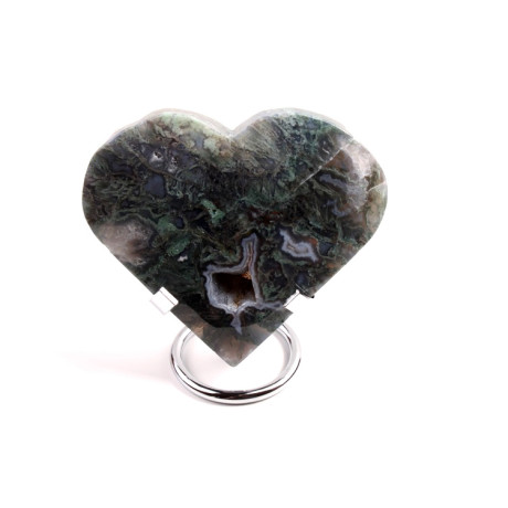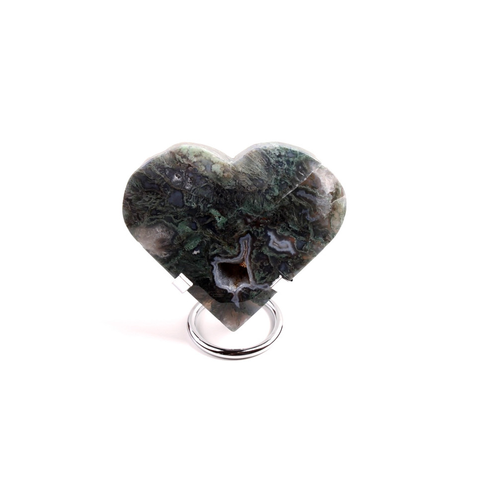 Mechový achát je často zpracováván do tvaru srdce, což symbolizuje lásku, harmonii a emocionální rovnováhu. Takovéto srdce může sloužit jako dekorace, talisman nebo součást šperků. Například přívěsek ve tvaru srdce s mechovým achátem a stříbrným úchytem je nejen elegantním šperkem, ale i nositelem pozitivní energie.