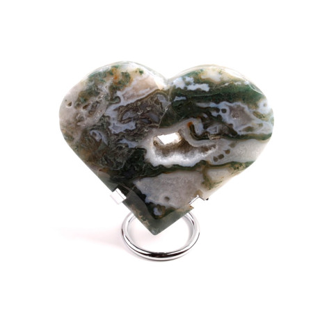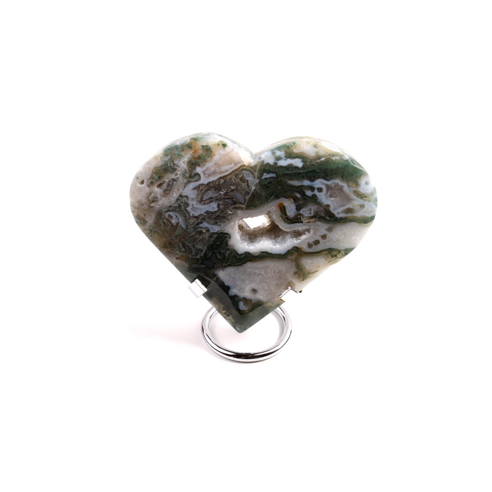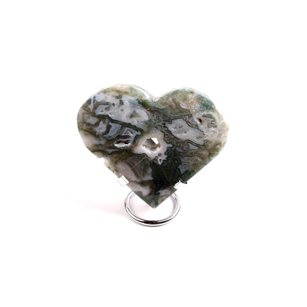 Mechový achát je často zpracováván do tvaru srdce, což symbolizuje lásku, harmonii a emocionální rovnováhu. Takovéto srdce může sloužit jako dekorace, talisman nebo součást šperků. Například přívěsek ve tvaru srdce s mechovým achátem a stříbrným úchytem je nejen elegantním šperkem, ale i nositelem pozitivní energie.