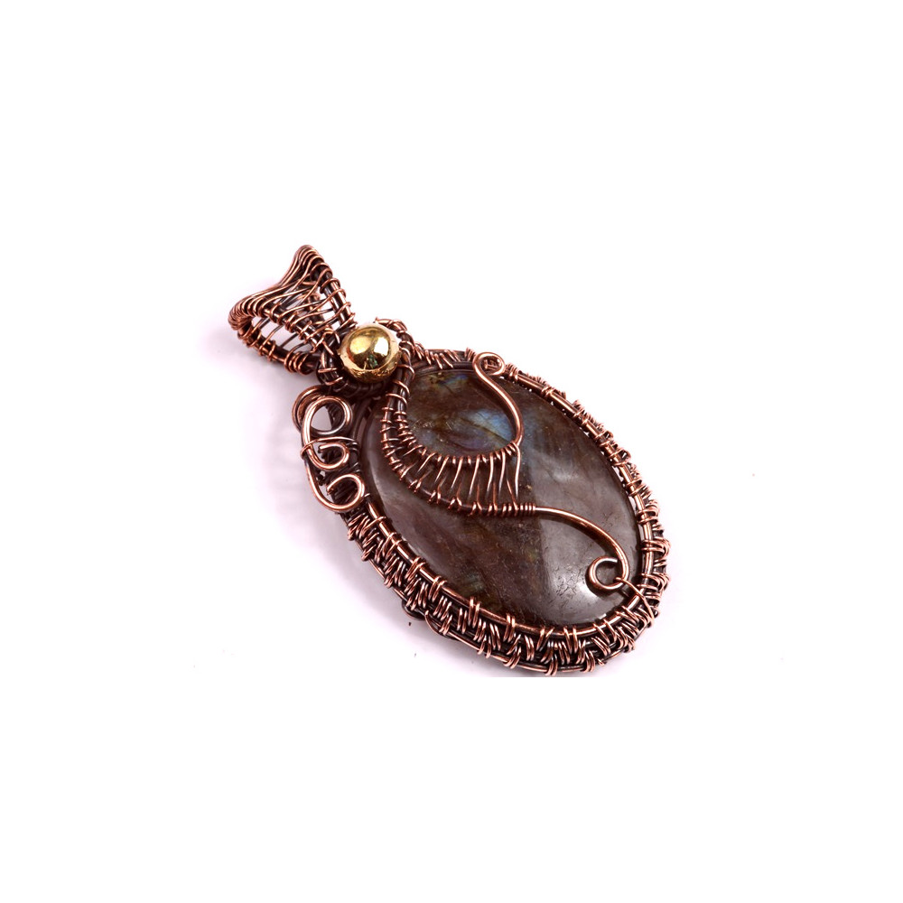 Tento nádherný přívěsek z minerálu labradorit je mistrovsky obplétán měděným drátkem, který umocňuje jeho přirozené kouzlo. Labradorit je známý pro své unikátní optické vlastnosti zvané labradorescence, což se projevuje jako fascinující hra modrých a zelených odlesků při dopadu světla. Tyto zářivé odlesky jsou skvěle zvýrazněny v kontrastu s teplým měděným drátkem, který obklopuje kámen složitým a uměleckým vzorem.