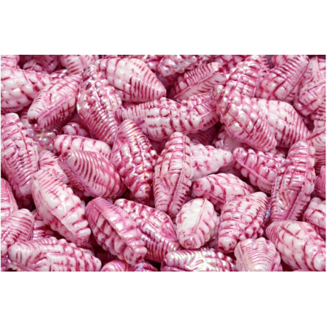 Bílá alabastrová barva s výrazným růžovým dekorem v rýhách a jemným duhovým efektem AB charakterizuje tyto Miter Shell Beads o rozměrech 16 x 8 mm. Tyto české skleněné korálky pocházejí z rodinné mačkárny Rutkovský, kde se snoubí tradiční české sklářství s precizní ruční výrobou mačkaných tvarů. Díky otvoru pro průvlek o velikosti 0,8 mm jsou korálky vysoce kompatibilní s běžnými návlekovými materiály, přičemž hladké stěny průtahu chrání vlákno před opotřebením během nošení hotového šperku a zajišťují snadnou manipulaci.