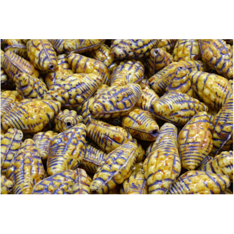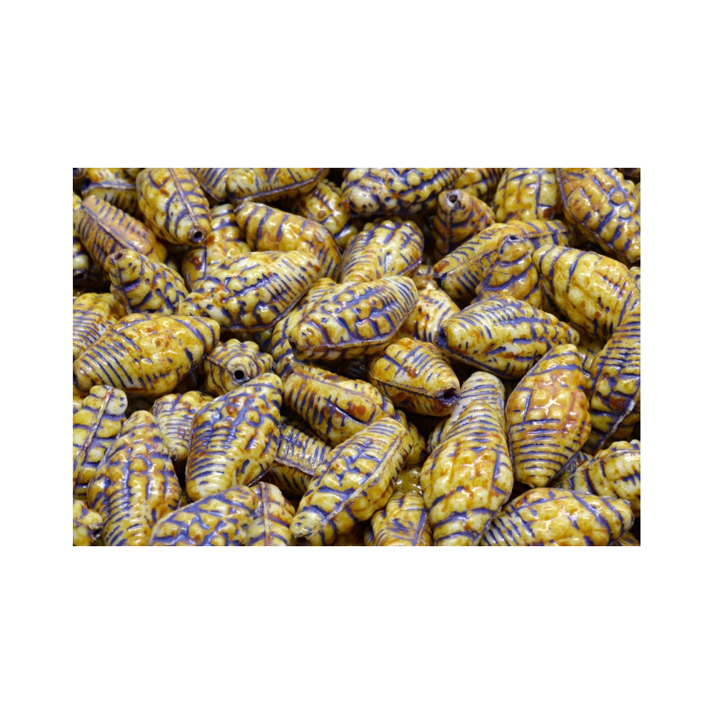 Písečné pobřeží a atmosféru letní dovolené vdechnou vašim šperkům tyto skleněné korálky ve tvaru Miter Shell Beads od rodinné firmy Rutkovský. Každý kus nese stopy tradičního českého sklářství, které se projevuje v detailním žebrování a precizní ruční výrobě v Jizerských horách. Povrchová úprava s hnědým efektem Travertine v kombinaci s výrazným modrým dekorem v rýhách vytváří fascinující texturu, která vynikne v náhrdelnících i náramcích inspirovaných přírodou.