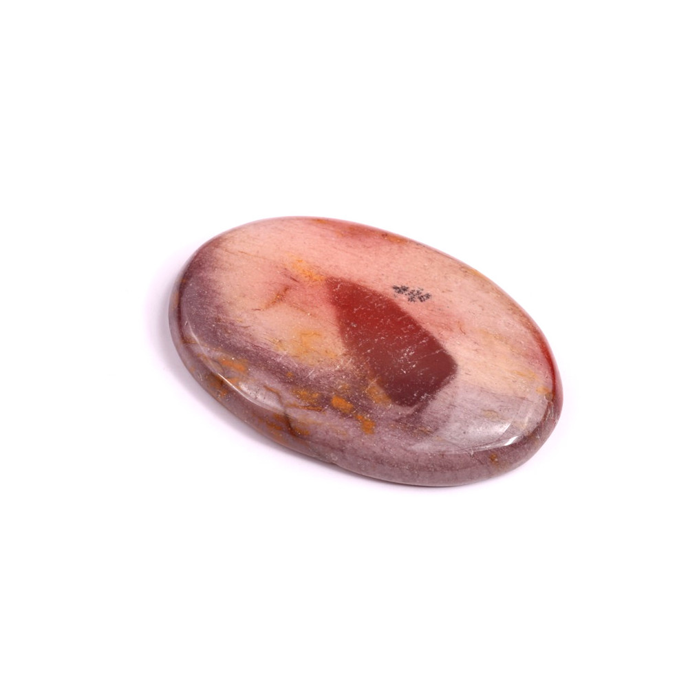 Kabošon z přírodního kamene Mookaite (Mokait) je výjimečným klenotem mezi minerály, známý svými teplými tóny a unikátní kresbou. Mokait se vyznačuje nádhernými odstíny žluté, červené, hnědé a fialové, které tvoří nepravidelné přechody a skvrny, dodávající každému kabošonu jeho neopakovatelný vzhled. Tento minerál pochází z Austrálie, kde je hojně ceněn nejen pro svou estetickou hodnotu, ale i pro své údajné harmonizující vlastnosti.
