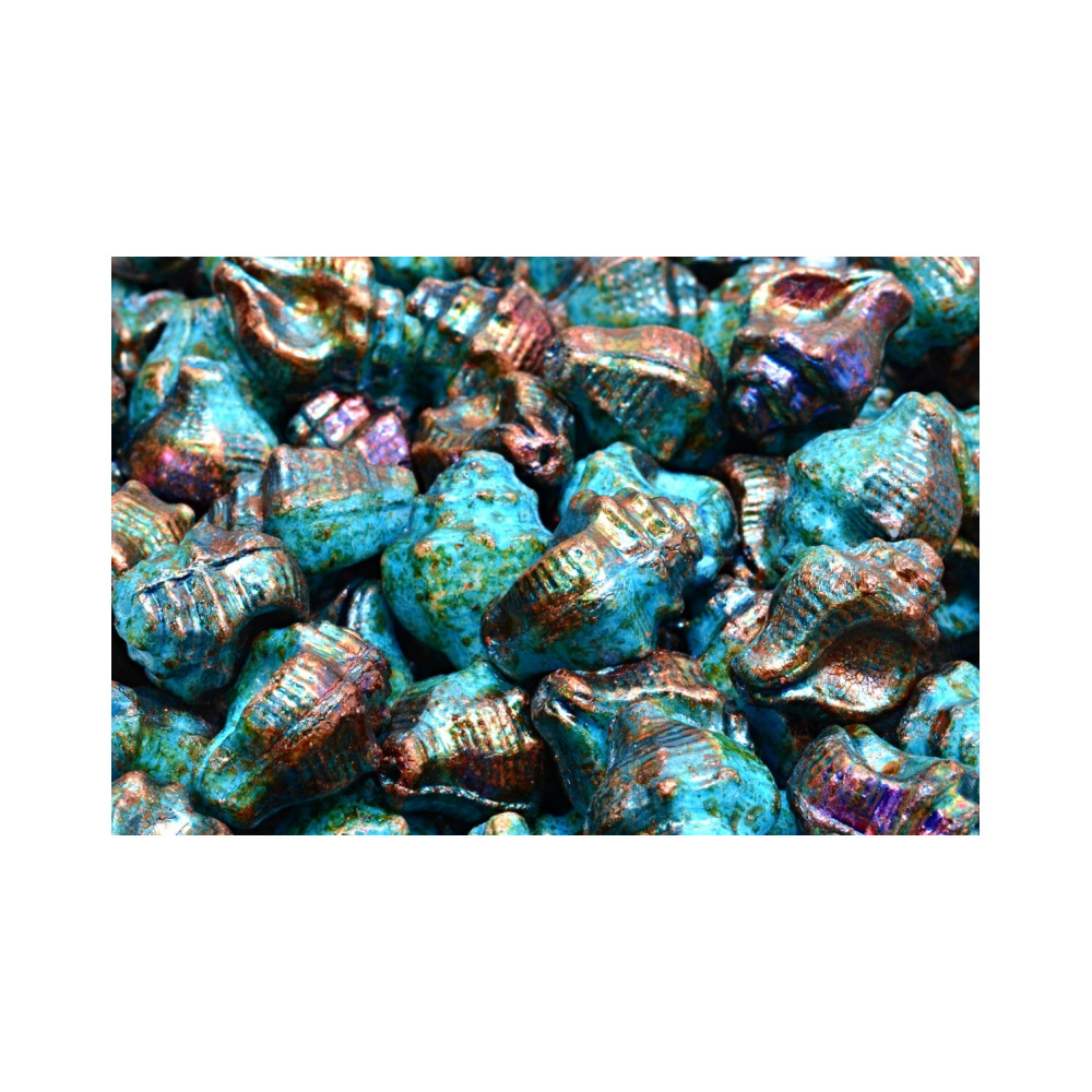 Tyrkysový odstín s bronzovou patinou dodává těmto skleněným korálkům tvaru Murex Shell Beads autentický starožitný vzhled. Tato ruční výroba z dílny rodinné firmy Rutkovský navazuje na nejlepší tradiční české sklářství. Každý kus vyniká detailním reliéfem mořské mušle, který v kombinaci s povrchovou úpravou Picasso vytváří unikátní designový prvek pro vaše šperky.