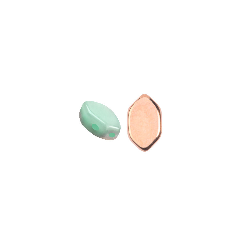 Modrozelená opálová barva v kombinaci s luxusním zlatým pokovem na hranách činí z těchto skleněných mačkaných korálků o rozměru 7 x 4 mm nepostradatelný materiál pro náročné designérky. Díky dvěma otvorům o velikosti 0,7 mm umožňují korálky stabilní a symetrické šití složitých vzorů. Povrchová úprava Green Aqua Opal Capri Gold dodává šperkům hloubku a měňavý efekt, který se mění podle úhlu dopadu světla.