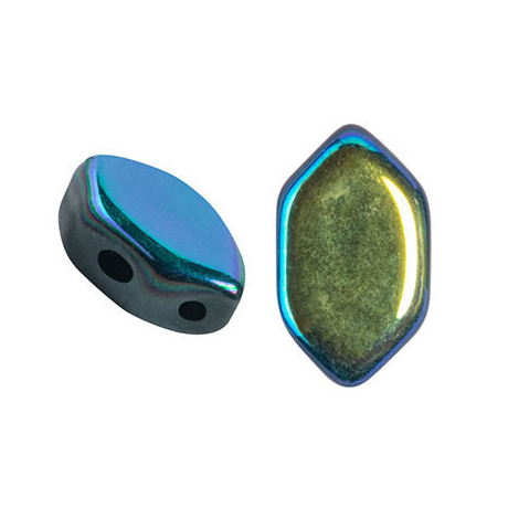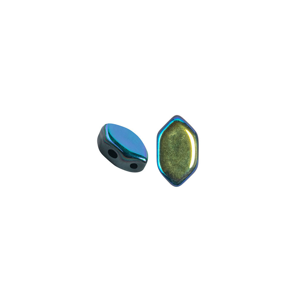 Černé korálky Paros® par Puca® č. 83 s úpravou JET AB vynikají svým specifickým tvarem o rozměru 7 x 4 mm a dvěma průchozími otvory. Temný základ z českého mačkaného skla je obohacen o duhový odlesk, který připomíná polární záři a dodává šperkům hloubku a luxusní vzhled. Pro výrazný kontrast tyto korálky zkombinujte se zlatou barvou, nebo pro jemnější efekt zvolte tóny v odstínu hematitová.