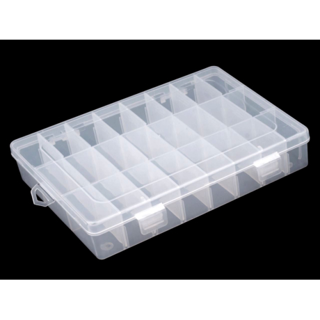 Plastová krabička je vhodná pro korálkářky. Obsahuje max. 24 přihrádek o velikosti 2 x 4 cm. Můžete je však regulovat, protože jednotlivé přepážky (21 ks) se dají odstranit. Pokud odstraníte všechny, budete mít 3 přihrádky o velikosti 4 x 19 cm. Krabička je uzavíratelná.