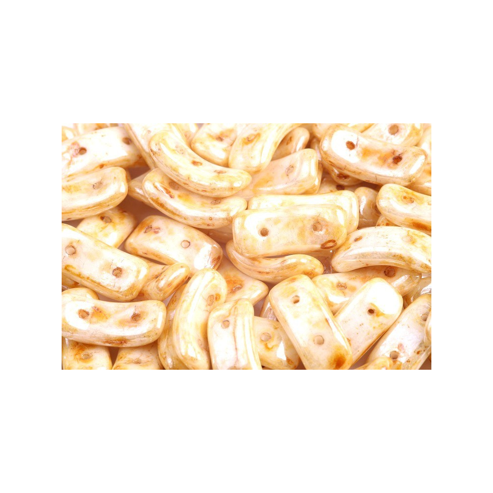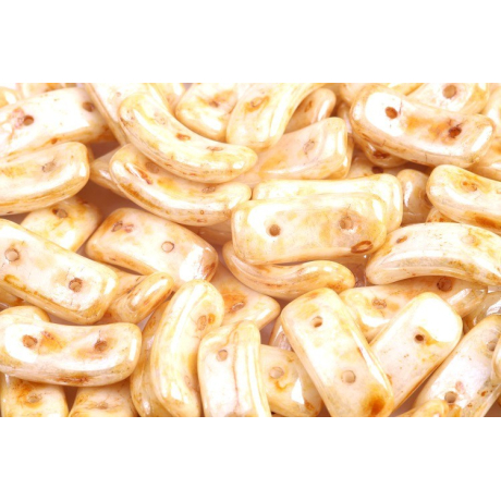 Rozměr 3,5 x 15,5 mm a dvoudírkové provedení dělají z těchto korálků nepostradatelný prvek pro prostorové šití šperků i jednoduché navlékané vzory. Díky prohnutému tvaru do sebe perle krásně zapadají a vytvářejí zajímavé textury připomínající vlnky. Bílá a béžová barva s medovými skvrnami vynikne zejména v kombinaci s přírodními tóny. Pro výrazný kontrast je můžete zkombinovat s černým jetem, zatímco harmonická šedá nebo neutrální červený siam podtrhnou jejich hloubku.