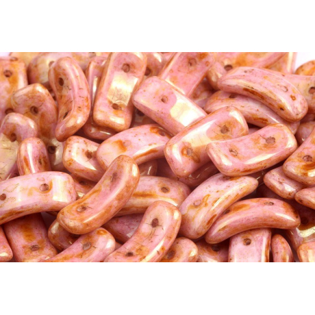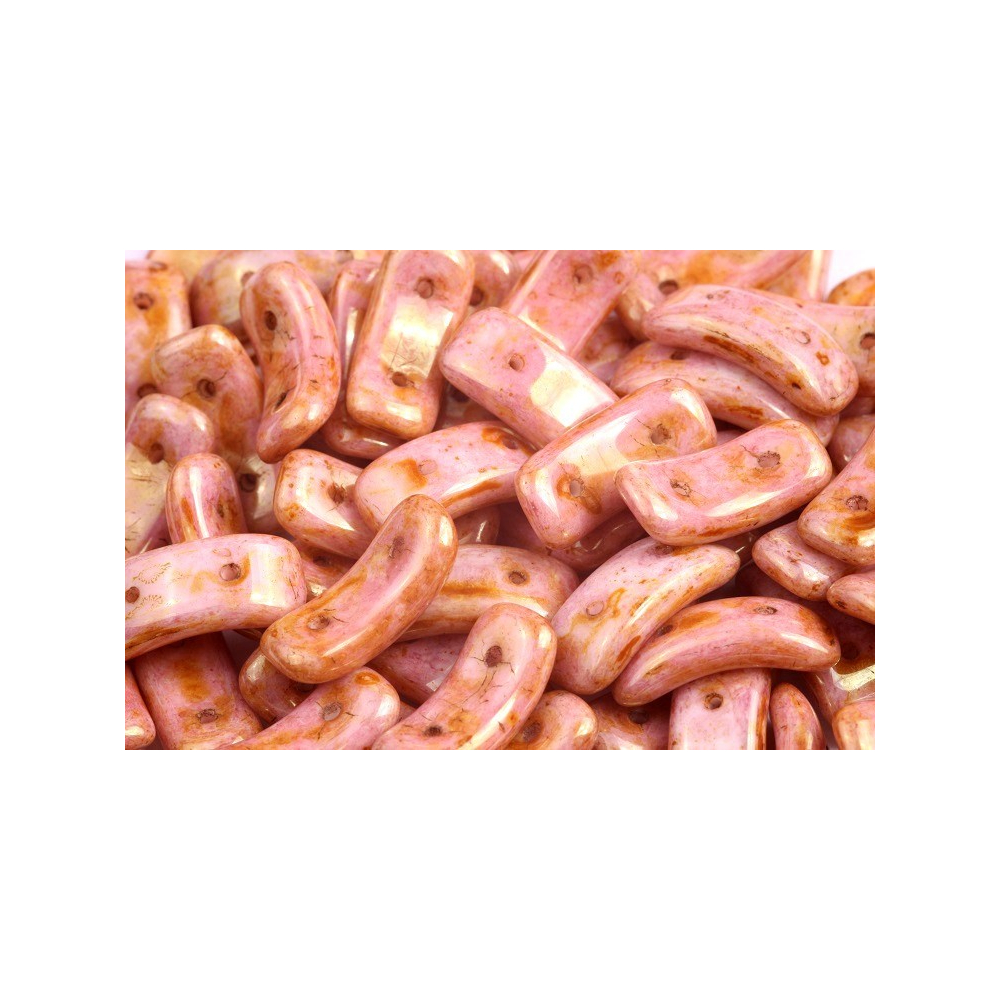 Růžový základ v odstínu White Alabaster s výraznou povrchovou úpravou Picasso Red definuje unikátní skleněné perle z tradiční české produkce Preciosa. Rozměry 3,5 x 15,5 mm a prohnutý tvar typu Bow umožňují vytvářet dynamické organické tvary, přičemž dva souběžné otvory o průměru 0,8 mm zajišťují stabilitu v náročných šitých konstrukcích. Při práci oceníte hladký průtah pro korálkovací jehly velikosti 10-12, které v kombinaci s pevnou nití S-lon Fire dovolují vícenásobný průchod nití korálkem bez rizika poškození materiálu nebo nadměrného tření.