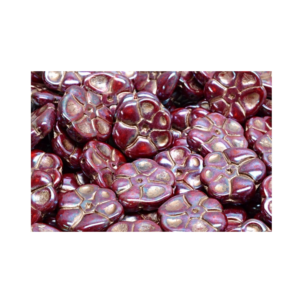 Tradiční české sklářství ožívá v každém detailu, který nabízejí tyto mačkané skleněné korálky ve tvaru květiny. Korálky Petrklíč o velikosti 15 x 15 mm jsou vyráběny technologií mačkání skla v severních Čechách, kde mistři skláři z firmy Rutkovský kladou důraz na precizní reliéf okvětních lístků. Povrchová úprava kombinuje sytou vínovou barvu s efektem nebula a jemnou měděnou patinou, která zvýrazňuje strukturu květu a dodává mu starožitný vzhled.