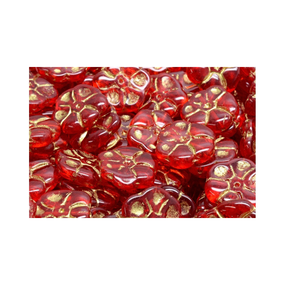 Volba tohoto specifického tvaru od výrobce Rutkovsky je ideální pro autory, kteří hledají výrazný centrální prvek, jenž se liší od drobných kuliček nebo ohňovek svou plochou a texturou. Díky transparentnímu rubínovému základu korálek krásně propouští světlo, zatímco zlatý povrchový dekor zvýrazňuje žilnatění okvětních lístků, což z nich dělá unikátní kousek pro romantické šperky s nádechem historie a vintage elegance.