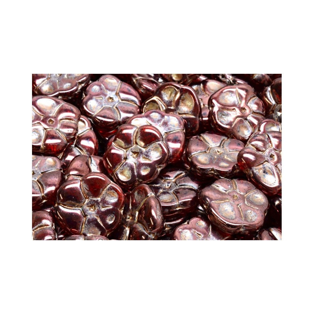 Měděný odlesk na temně červeném podkladu dělá z těchto kytiček ideální volbu pro romantické náušnice s patinou nebo výrazný náhrdelník v boho stylu. Tyto české skleněné korálky ve tvaru petrklíče o rozměru 15 x 15 mm vynikají precizním zpracováním z dílny výrobce Rutkovský, který je zárukou kvality a stálosti barev. Při tvorbě přírodních kompozic je můžete snadno propojit s prvky jako jsou skleněné lístečky, čímž vytvoříte bohatý trojrozměrný design s květinovým motivem.