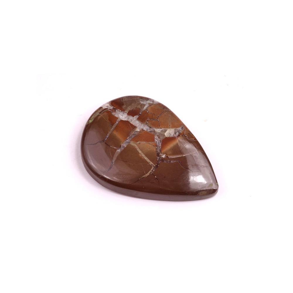 Pyrite Septarian kabošon je unikátní kámen, který kombinuje zlatavé inkluze pyritu s bohatými hnědými a béžovými tóny septarianu. Tento kámen je známý svou zajímavou strukturou připomínající praskliny či přírodní mozaiku, což mu dodává fascinující a nezaměnitelný vzhled.