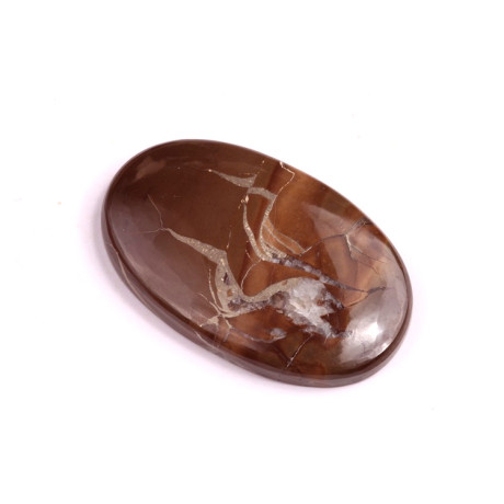 Pyrite Septarian kabošon je unikátní kámen, který kombinuje zlatavé inkluze pyritu s bohatými hnědými a béžovými tóny septarianu. Tento kámen je známý svou zajímavou strukturou připomínající praskliny či přírodní mozaiku, což mu dodává fascinující a nezaměnitelný vzhled.