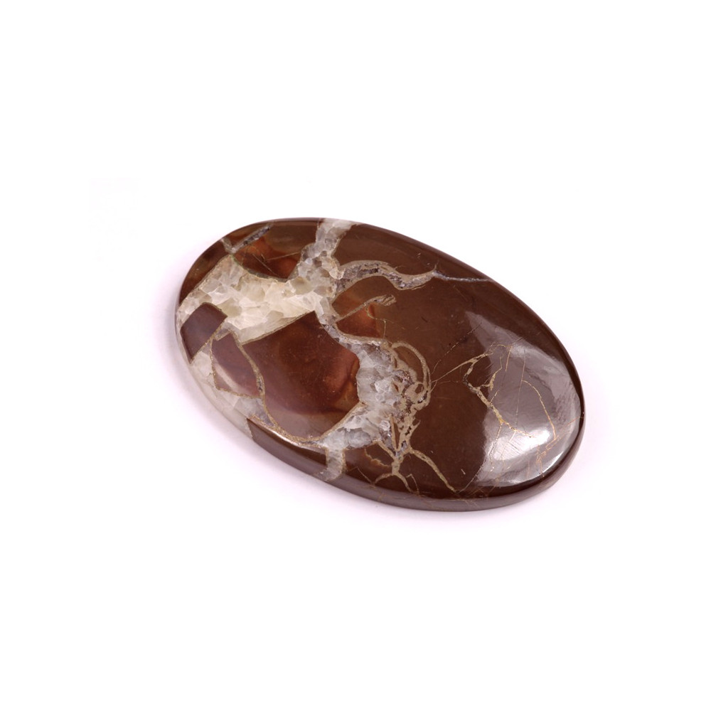 Pyrite Septarian kabošon je unikátní kámen, který kombinuje zlatavé inkluze pyritu s bohatými hnědými a béžovými tóny septarianu. Tento kámen je známý svou zajímavou strukturou připomínající praskliny či přírodní mozaiku, což mu dodává fascinující a nezaměnitelný vzhled.
