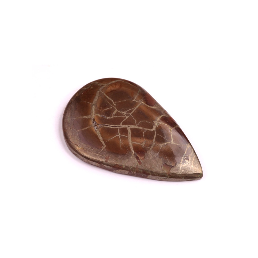 Pyrite Septarian kabošon je unikátní kámen, který kombinuje zlatavé inkluze pyritu s bohatými hnědými a béžovými tóny septarianu. Tento kámen je známý svou zajímavou strukturou připomínající praskliny či přírodní mozaiku, což mu dodává fascinující a nezaměnitelný vzhled.