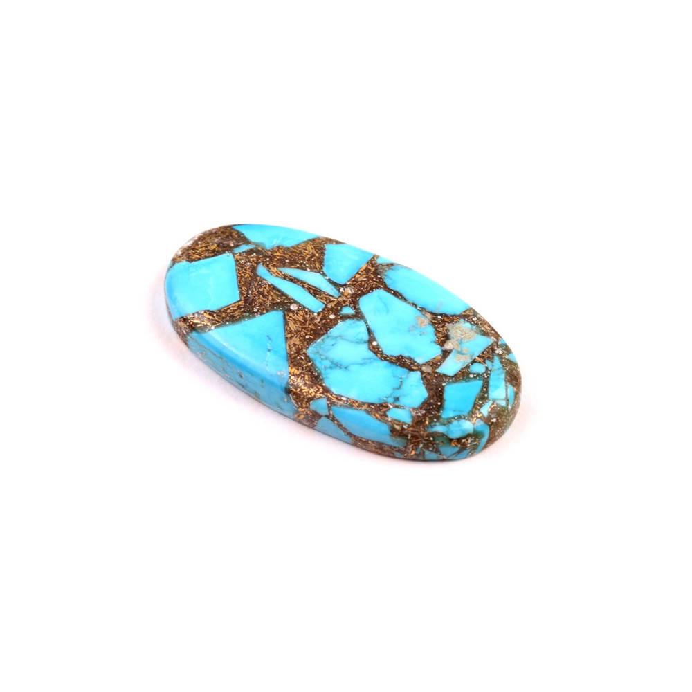 Kabošon Rekonstruovaný Tyrkys (Tyrkys, měď, pryskyřice) Velikost cca 39x19x6 mm Cena za 1 ks...
