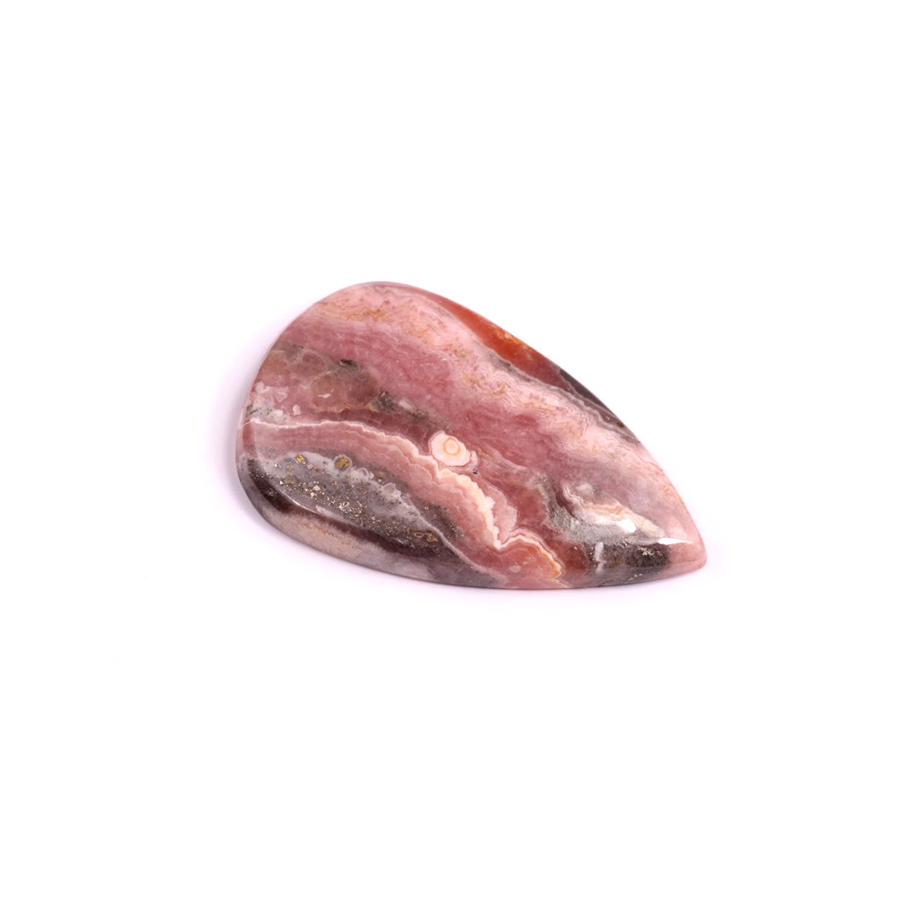 Rhodochrosite je ceněn pro svou spojitost s láskou a harmonií, zatímco přítomnost pyritu přidává dotek ochrany a síly. Tento kabošon je perfektní pro výrobu přívěsků nebo náhrdelníků, přičemž díky svému plochému zadnímu profilu je snadno použitelný v různých technikách, včetně wire-wrappingu a klasického osazení do kovových lůžek formou obcínování.