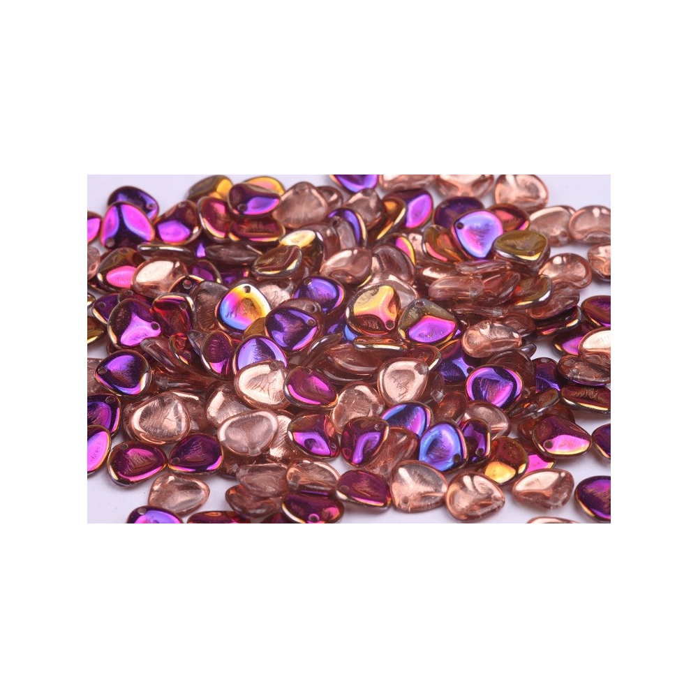 Rose Petal Beads 8 x 7 mm disponují unikátním metalickým povrchem, který při dopadu světla mění barvu od sytě fialové až po bronzové tóny. Tato povrchová úprava typu Sliperit na čirém skleněném základu dodává šperkům hloubku a luxusní vzhled, který je typický pro tradiční české sklářství a ruční výrobu.