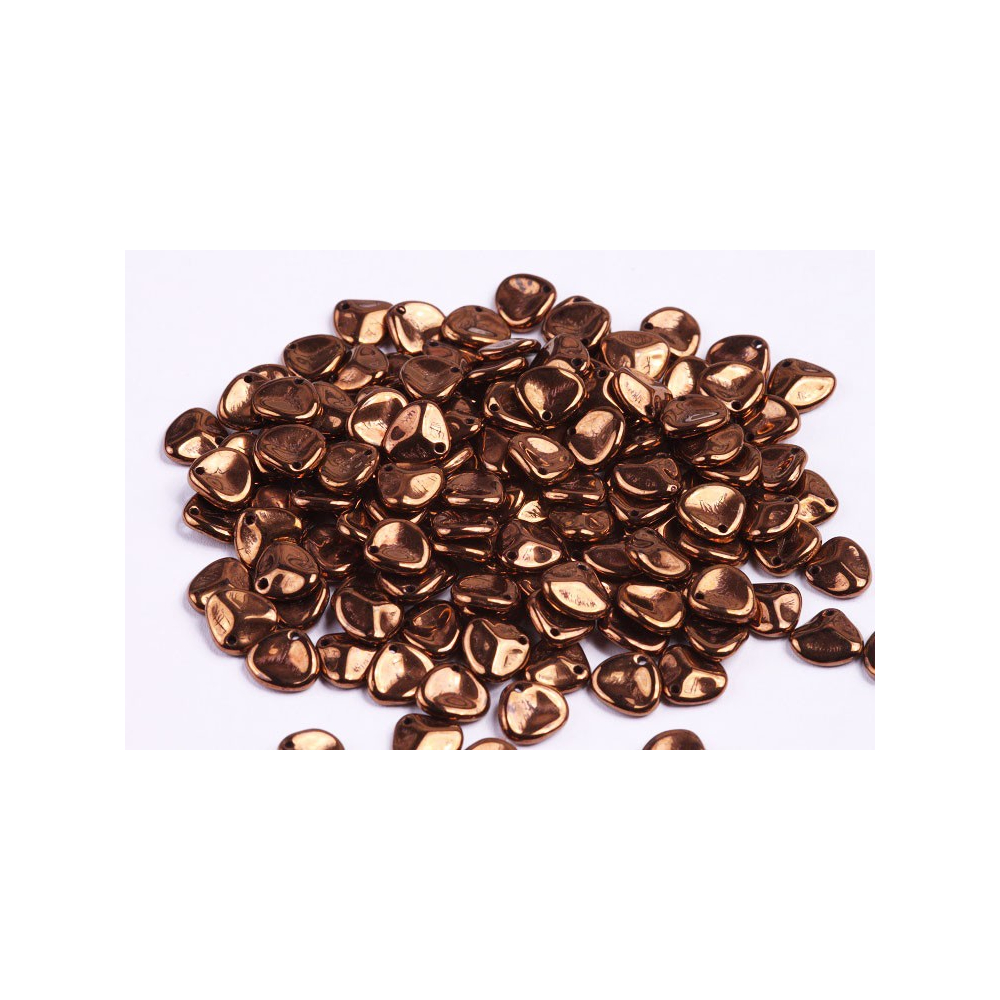 Bronzová metalická úprava na temném podkladu definuje tyto skleněné korálky Rose Petal Beads 8 x 7 mm, které pocházejí z tradiční rodinné huti Rutkovský. Oproti běžným plochým lístkům vynikají tyto ručně mačkané korálky svým organickým, mírně prohnutým tvarem, který věrně napodobuje skutečné okvětní plátky růží. Při dopadu světla vytváří povrch Jet Bronze hluboké odlesky, což dodává hotovému šperku luxusní a nadčasový nádech, který u strojově vyráběných alternativ často chybí.