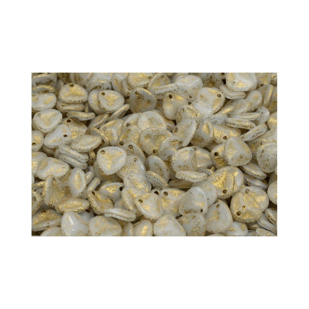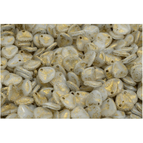 Bílá barva s efektní zlatou patinou dodává každému lístku starožitný nádech, což z nich činí ideální volbu pro všívané šperky (bead embroidery) nebo bohaté prostorové náhrdelníky. Díky svému asymetrickému tvaru o rozměru 8 x 7 mm do sebe jednotlivé komponenty krásně zapadají a umožňují vytvářet věrné imitace květů, poupat či abstraktních organických struktur. Ruční výroba zaručuje, že každý lístek má svou neopakovatelnou kresbu zlatého dekoru.