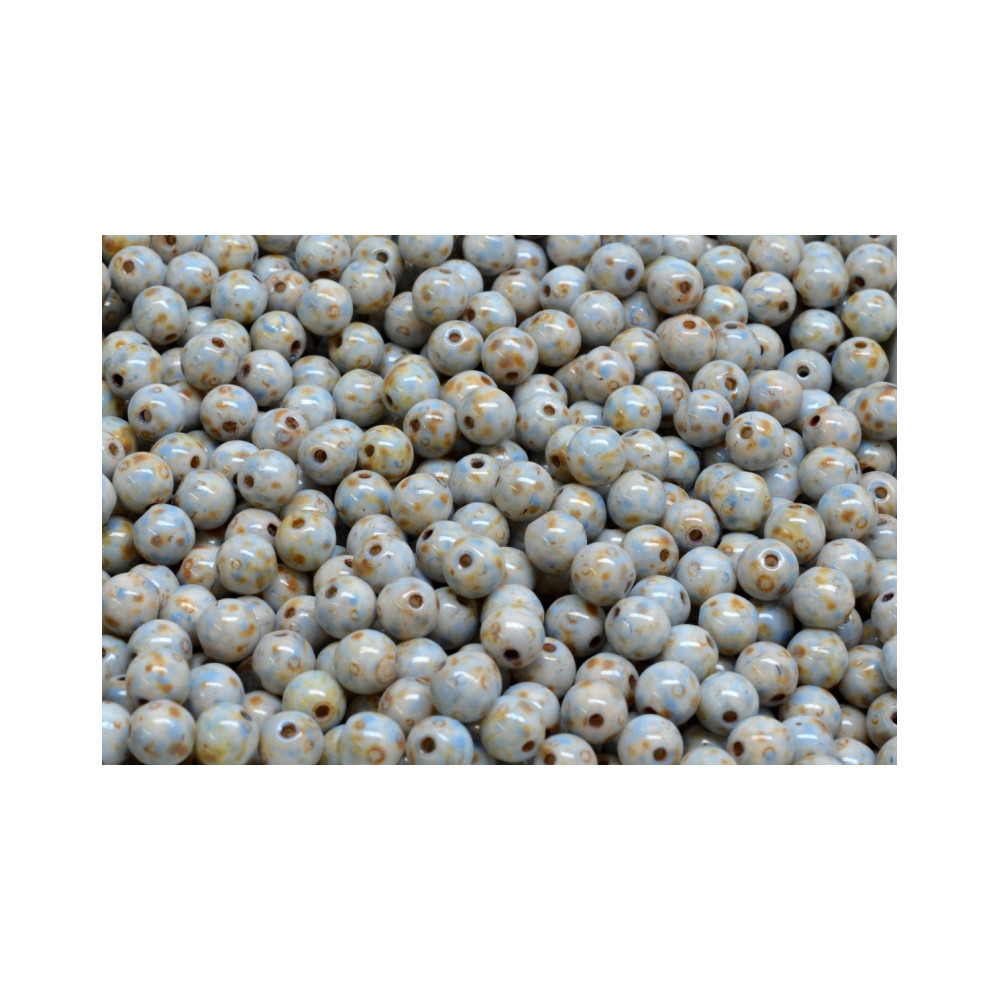 Světle modrá barva v kombinaci s efektní povrchovou úpravou Picasso definuje tyto precizně zpracované skleněné korálky kuličky o průměru 4 mm. Každý kus z dílny rodinné firmy Rutkovský prochází procesem ručního lisování, což zaručuje vysokou kvalitu a konzistenci průtahu o velikosti 0,8 mm. Tradiční české sklářství se zde snoubí s moderní estetikou, kde nepravidelné hnědé skvrnky na modrém podkladu imitují přírodní kámen nebo keramiku.