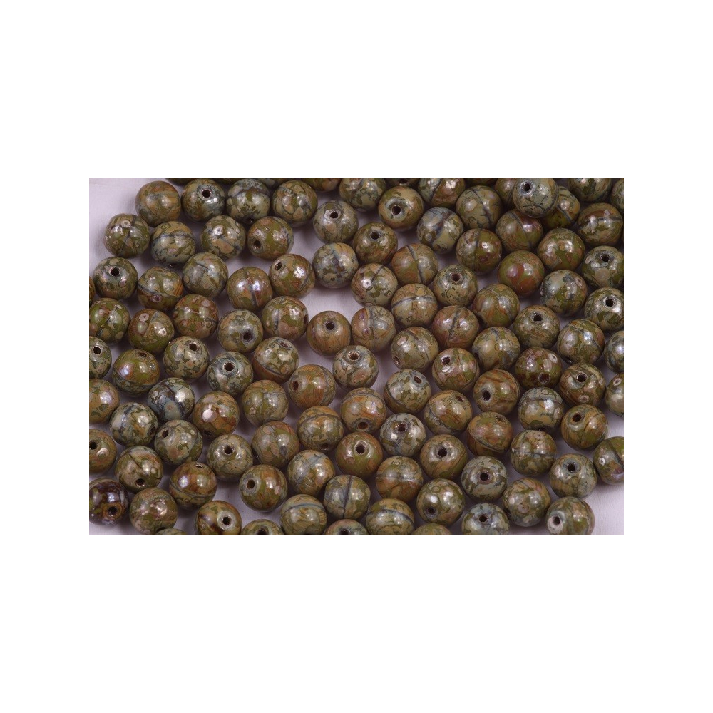 Olivově zelené tóny s nezaměnitelným Picasso efektem vdechují těmto kuličkám organický vzhled přírodních kamenů. Ručně mačkané skleněné korálky z dílny rodinné firmy Rutkovský reprezentují to nejlepší z tradičního českého sklářství. Každý kus nese unikátní kresbu, která vynikne v projektech inspirovaných přírodou a zemitými barevnými paletami.