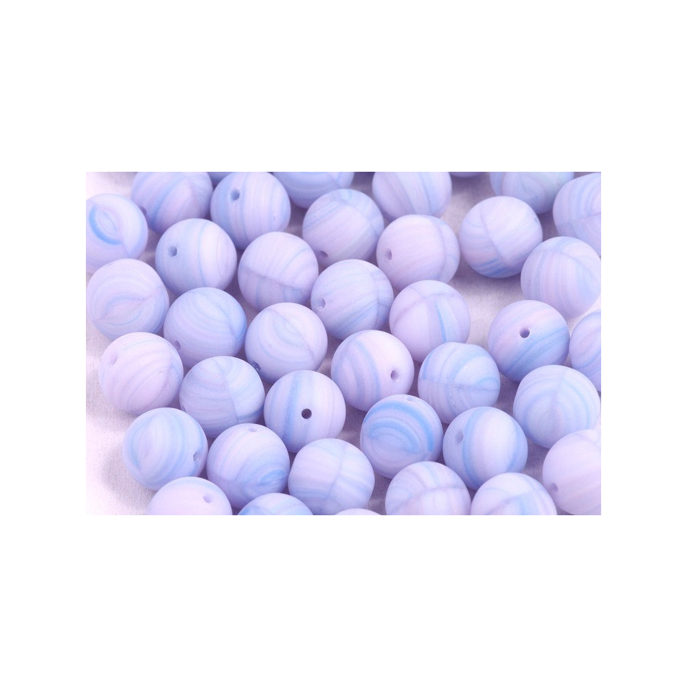 Světle modrý odstíny s jemným mramorováním definují tyto skleněné korálky kuličky z dílny rodinné firmy Rutkovský, které v sobě snoubí poctivé tradiční české sklářství a moderní design. Matná povrchová úprava dodává materiálu sametovou hloubku a zajišťuje, že výsledná bižuterie působí velmi sofistikovaným dojmem. Při tvorbě náhrdelníků doporučujeme použít rokajl Preciosa jako distanční prvek, který umožní těmto osmimilimetrovým kuličkám plně vyniknout. Tato uklidňující barva krásně ladí s neutrálními tóny stříbrné nebo harmonickou tyrkysovou.