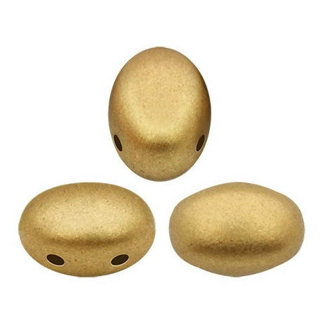 Rozměry 5 x 7 mm a precizní matná zlatá povrchová úprava definují tyto unikátní dvoudírkové korálky Samos® par Puca® vyrobené z kvalitního českého mačkaného skla. Dva paralelní otvory s hladkým vnitřním povrchem umožňují snadný vícenásobný průchod nití korálkem, což je klíčové pro stabilitu složitých prostorových vzorů. V designu se tyto korálky často využívají v kombinaci s tvary Arcos® par Puca® pro vytvoření elegantního rámování kolem středových kabošonů.
