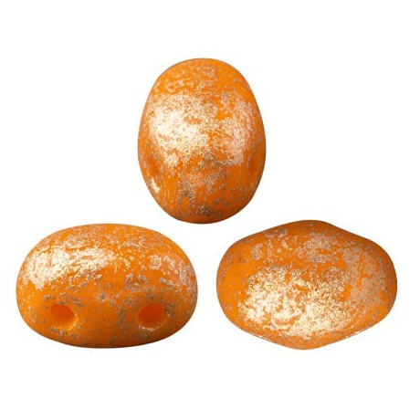 Oválný, jemně klenutý tvar s plochou spodní stranou a dvěma otvory umožňuje těmto korálkům dokonale přilnout k podkladu nebo vytvářet složité prostorové struktury. Povrchová úprava Opaque Hyacinth Splash dodává korálkům organický vzhled s nádechem luxusu díky jemným metalickým cákancům na neprůhledném oranžovém základu.