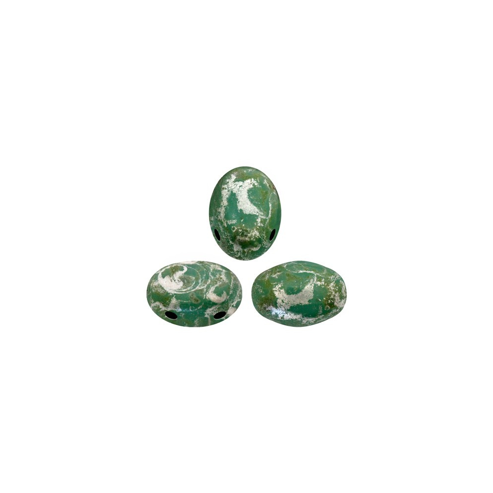 Zelená barva s nádechem antiky vrací do moderní tvorby kouzlo starobylých artefaktů a připomíná bohatou historii české sklářské výroby. Tyto unikátní skleněné korálky v odstínu Opaque Green Turquoise Picasso jsou výsledkem spojení precizního řemesla ze severních Čech a vytříbeného francouzského vkusu. Právě v srdci Evropy se zrodil tento specifický oválný tvar, který svým organickým vzhledem a dvěma průtahy otevírá šperkařům dveře k nevídaným geometrickým kompozicím a hře se světlem.