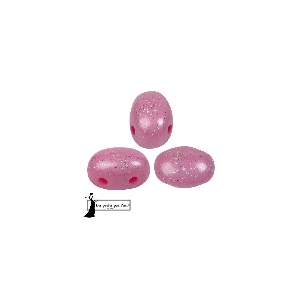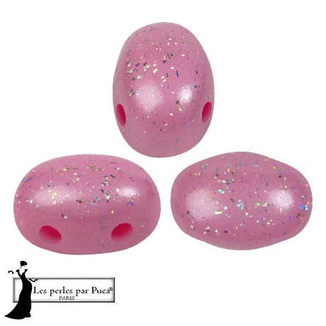 Růžová barva s fascinujícím efektem hvězdné oblohy dominuje těmto oválným korálkům Samos® par Puca®, které představují vrchol precizního zpracování českého mačkaného skla. Rozměry 5 x 7 mm spolu se dvěma rovnoběžnými otvory o průměru 0,8 mm umožňují naprosto přesné sesazení v komplexních geometrických vzorech. Při práci s těmito korálky doporučujeme použít pevný rokajl Preciosa ve velikostech 10/0 nebo 11/0, který ideálně vyplní mezery mezi jednotlivými dílky a zajistí strukturální stabilitu celého šperku.