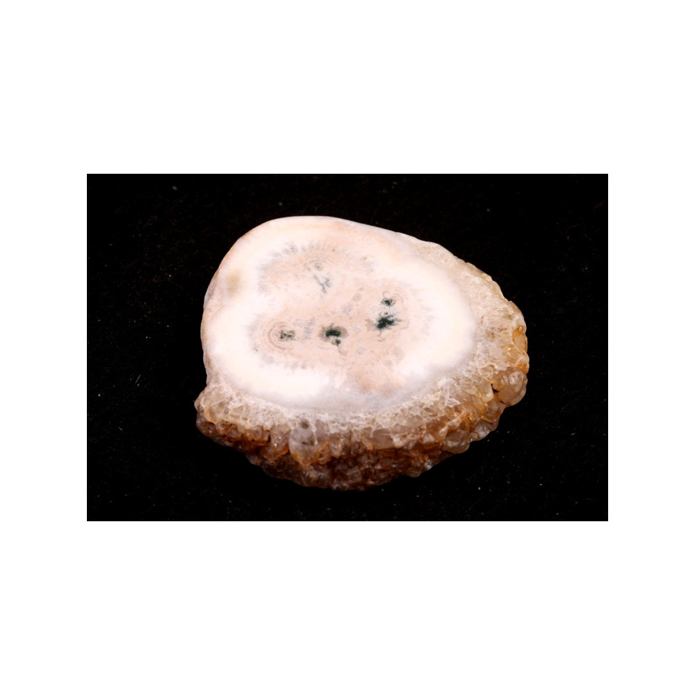 Kabošon z přírodního kamene Solar Quartz je jedinečným příkladem přírodní krásy a elegance. Tento minerál vzniká z křemenných krystalů, které se tvoří uvnitř geod a vytvářejí fascinující kruhové obrazy. Solar Quartz se často vyznačuje světle bílou až průsvitnou základní barvou, doplněnou jemnými inkluzemi, které mohou zahrnovat odstíny zelené, růžové či hnědé, což z něj činí klenot s jedinečnou barevnou strukturou. Právě tyto nepravidelné vzory a vrstvení mu dodávají zvláštní hloubku a přitažlivost.