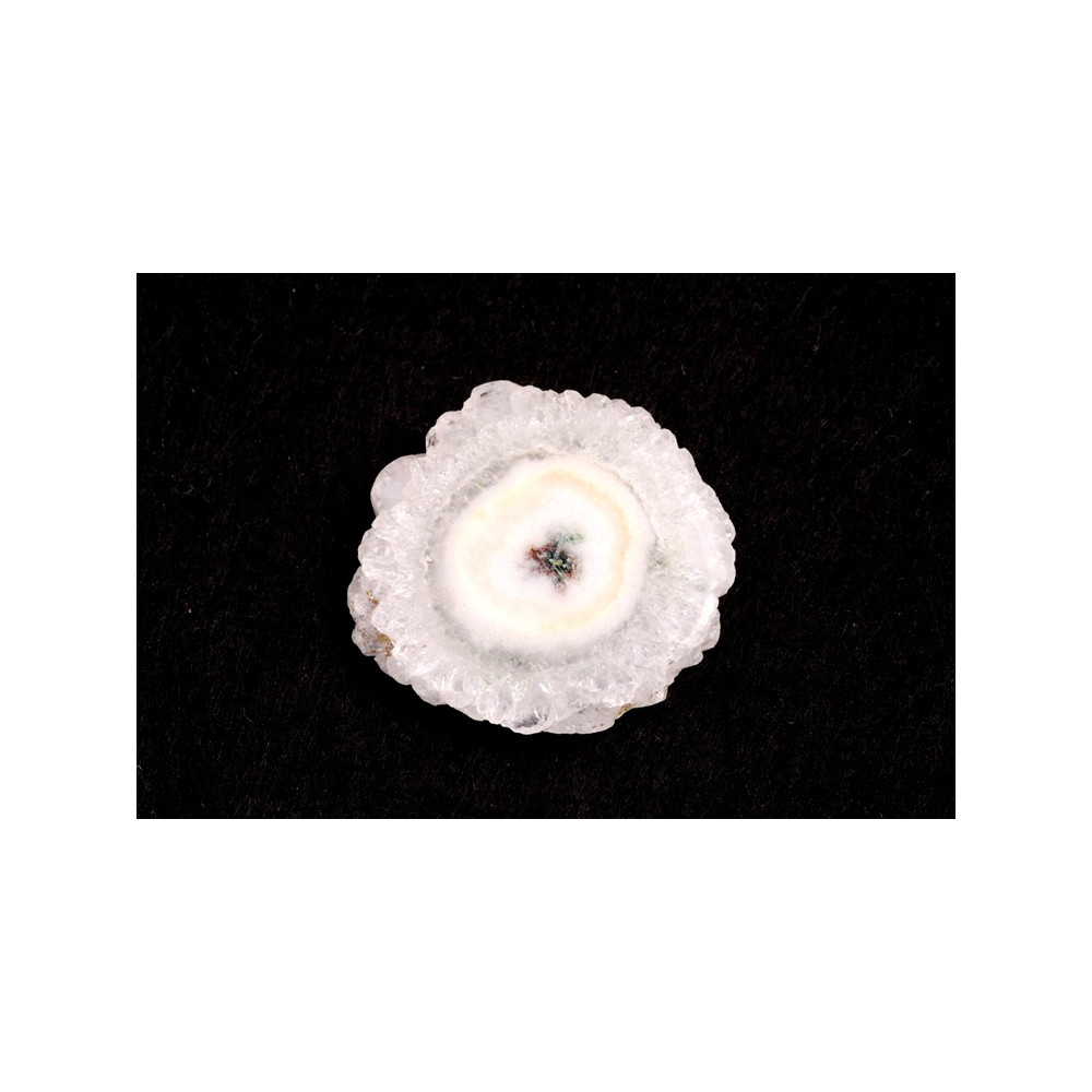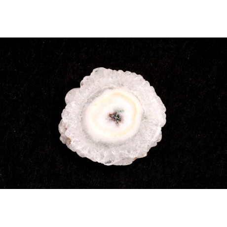 Kabošon z přírodního kamene Solar Quartz je jedinečným příkladem přírodní krásy a elegance. Tento minerál vzniká z křemenných krystalů, které se tvoří uvnitř geod a vytvářejí fascinující kruhové obrazy. Solar Quartz se často vyznačuje světle bílou až průsvitnou základní barvou, doplněnou jemnými inkluzemi, které mohou zahrnovat odstíny zelené, růžové či hnědé, což z něj činí klenot s jedinečnou barevnou strukturou. Právě tyto nepravidelné vzory a vrstvení mu dodávají zvláštní hloubku a přitažlivost.