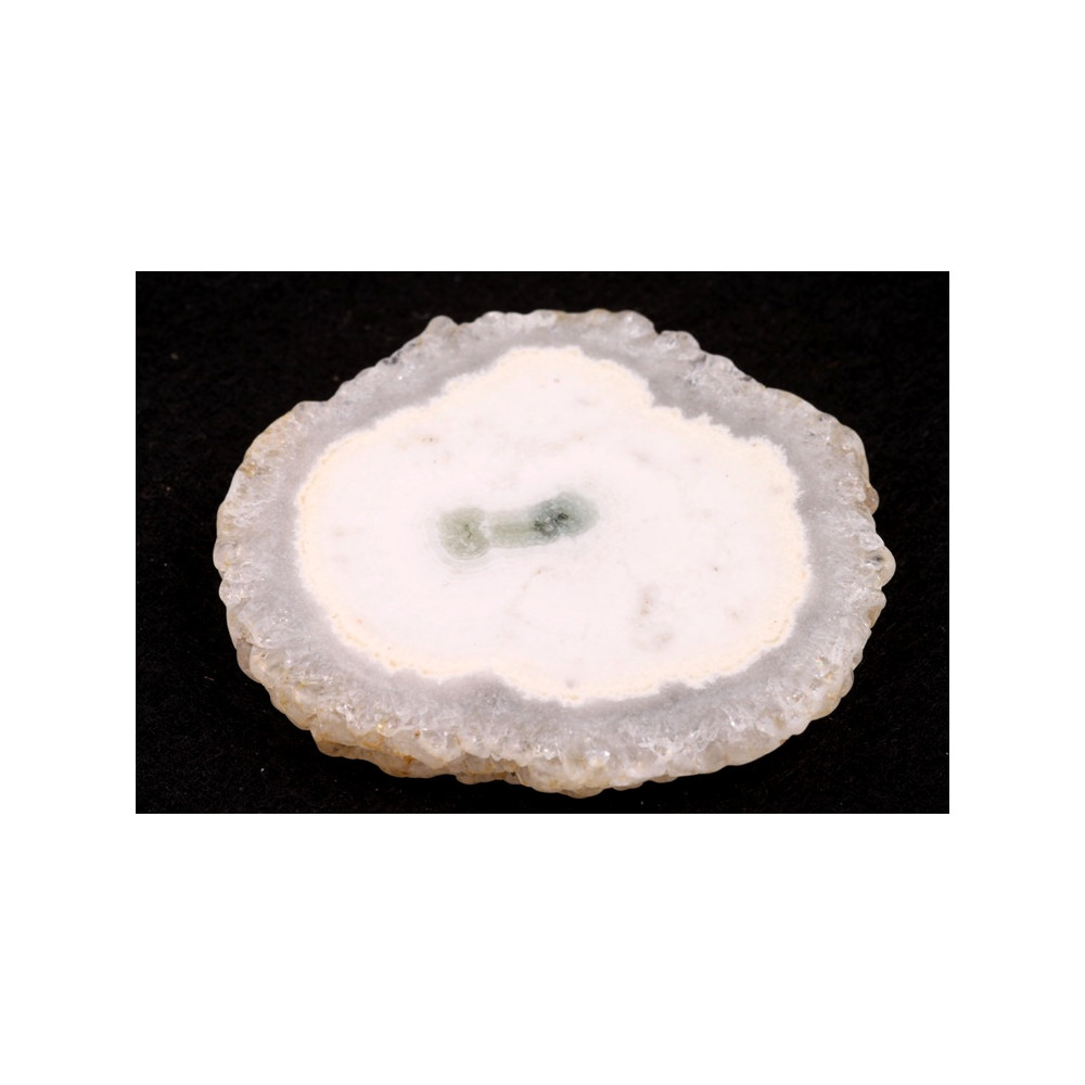 Kabošon z přírodního kamene Solar Quartz je jedinečným příkladem přírodní krásy a elegance. Tento minerál vzniká z křemenných krystalů, které se tvoří uvnitř geod a vytvářejí fascinující kruhové obrazy. Solar Quartz se často vyznačuje světle bílou až průsvitnou základní barvou, doplněnou jemnými inkluzemi, které mohou zahrnovat odstíny zelené, růžové či hnědé, což z něj činí klenot s jedinečnou barevnou strukturou. Právě tyto nepravidelné vzory a vrstvení mu dodávají zvláštní hloubku a přitažlivost.