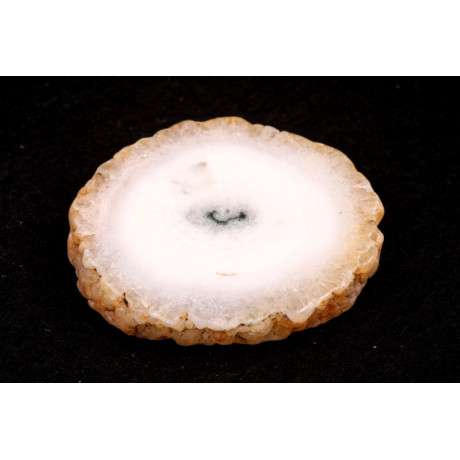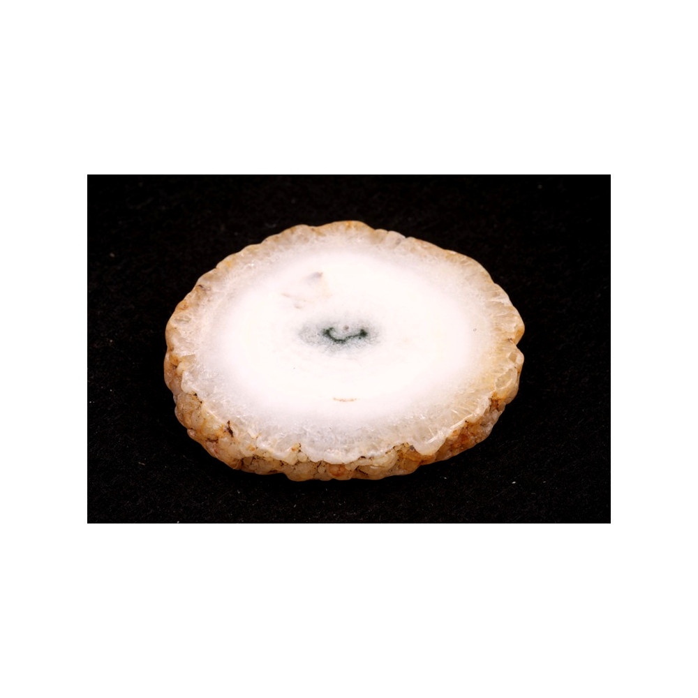 Kabošon z přírodního kamene Solar Quartz je jedinečným příkladem přírodní krásy a elegance. Tento minerál vzniká z křemenných krystalů, které se tvoří uvnitř geod a vytvářejí fascinující kruhové obrazy. Solar Quartz se často vyznačuje světle bílou až průsvitnou základní barvou, doplněnou jemnými inkluzemi, které mohou zahrnovat odstíny zelené, růžové či hnědé, což z něj činí klenot s jedinečnou barevnou strukturou. Právě tyto nepravidelné vzory a vrstvení mu dodávají zvláštní hloubku a přitažlivost.