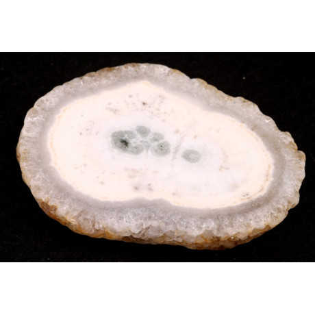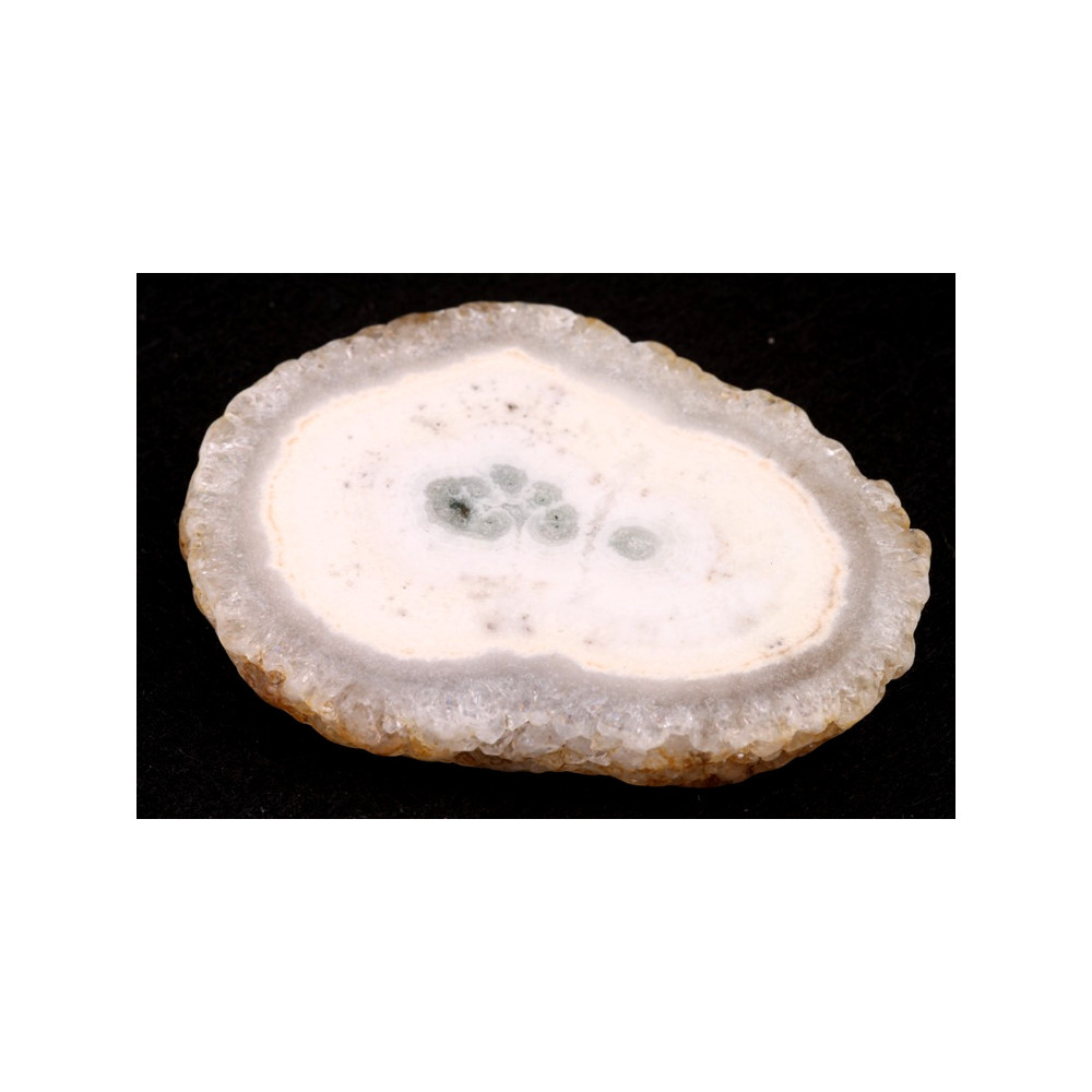 Kabošon z přírodního kamene Solar Quartz je jedinečným příkladem přírodní krásy a elegance. Tento minerál vzniká z křemenných krystalů, které se tvoří uvnitř geod a vytvářejí fascinující kruhové obrazy. Solar Quartz se často vyznačuje světle bílou až průsvitnou základní barvou, doplněnou jemnými inkluzemi, které mohou zahrnovat odstíny zelené, růžové či hnědé, což z něj činí klenot s jedinečnou barevnou strukturou. Právě tyto nepravidelné vzory a vrstvení mu dodávají zvláštní hloubku a přitažlivost.